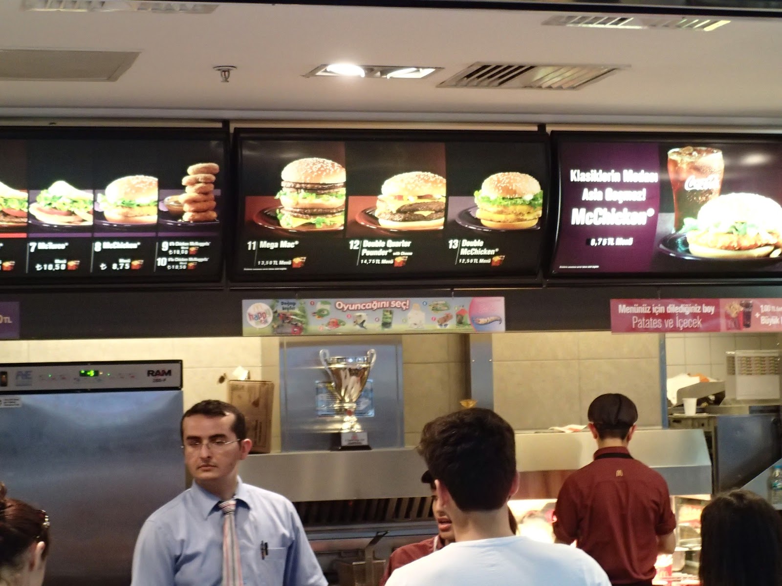 Istabul Cevahir is a six-story mall just a few stops north of Taksim Square in Istanbul. Each floor is centered around a soaring atrium that sports a massive 3, 6, 9, and 12 on the ceiling. Even from the lowest level of the mall, one can look up at these numbers and determine that these strange numbers represent a clock face. Many of the floors have small food stands interspersed throughout the common spaces of the mall, but floors five and six house the majority of the restaurants and food vendors. I must admit that I have never seen a more interesting combination of Turkey-based restaurants and larger American or global chain restaurants. While not uncommon to see Starbuck's, McDonald's, Burger King, and Kentucky Fried Chicken around the world, I was surprised to see Krispy Kreme, Sbarro, Popeyes Chicken, and Carl's Junior.